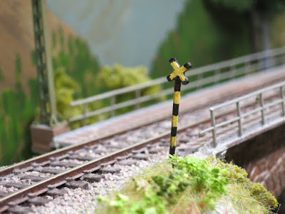 Le réseau étant situé dans un milieu plutôt montagnard, il est évidemment équipé de signaux pour le déneigement selon les normes des chemins de fer autrichien. Ces signaux destinés à l’opérateur du chasse-neige sont aisément reconnaissables car ils sont fixés sur des poteaux noir munis de bandes horizontales jaune. Les signaux implantés sur le réseau ont été réalisé à partir de fil de fer de 1.5mm de diamètre peint en noire et jaune. Le signal, soit une croix, soit un trait horizontal, a été imprimé et collé. L’inconvénient de cette méthode de fabrication est la fragilité de la partie imprimée qui se décolle facilement en cas « d’accident » (p.ex. un wagon qui déraille juste à côté ou une main indélicate).